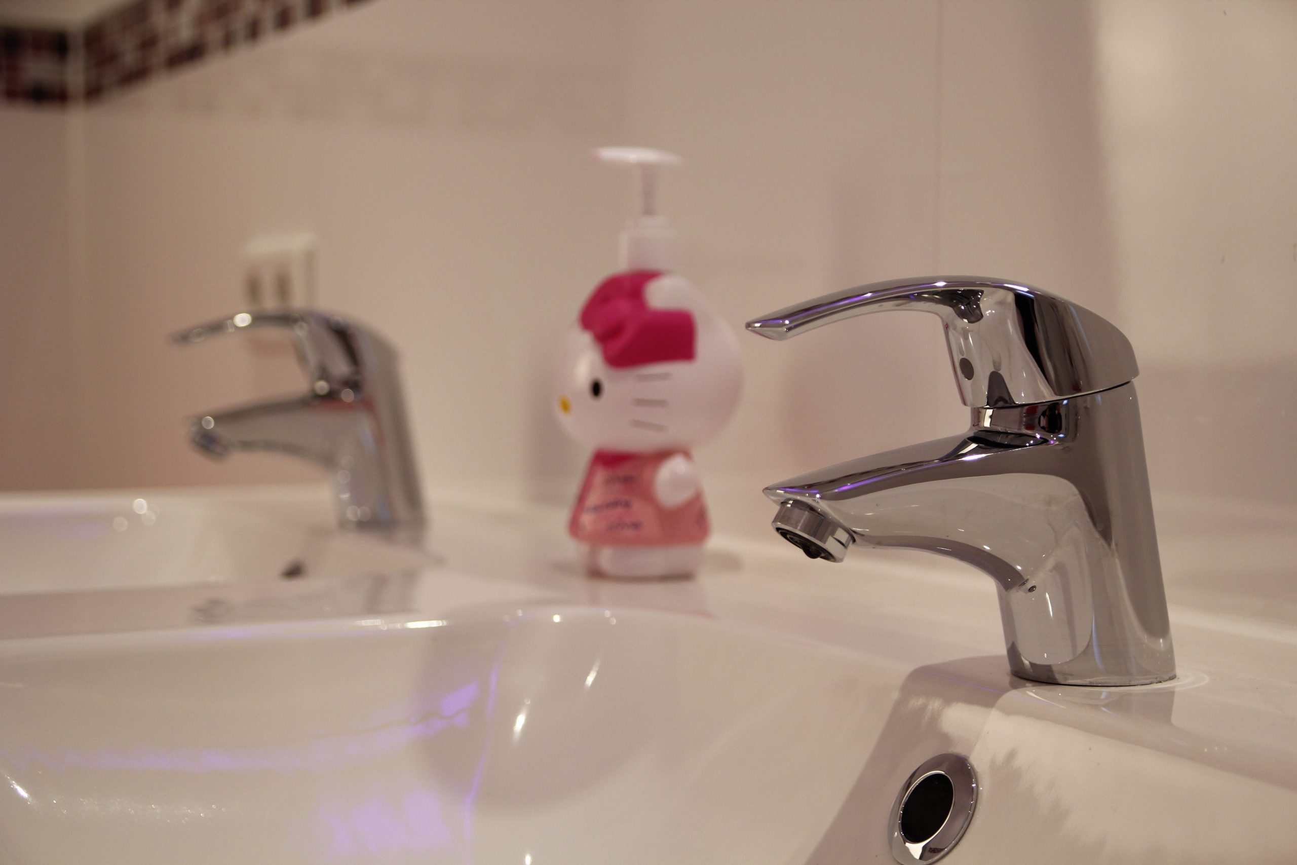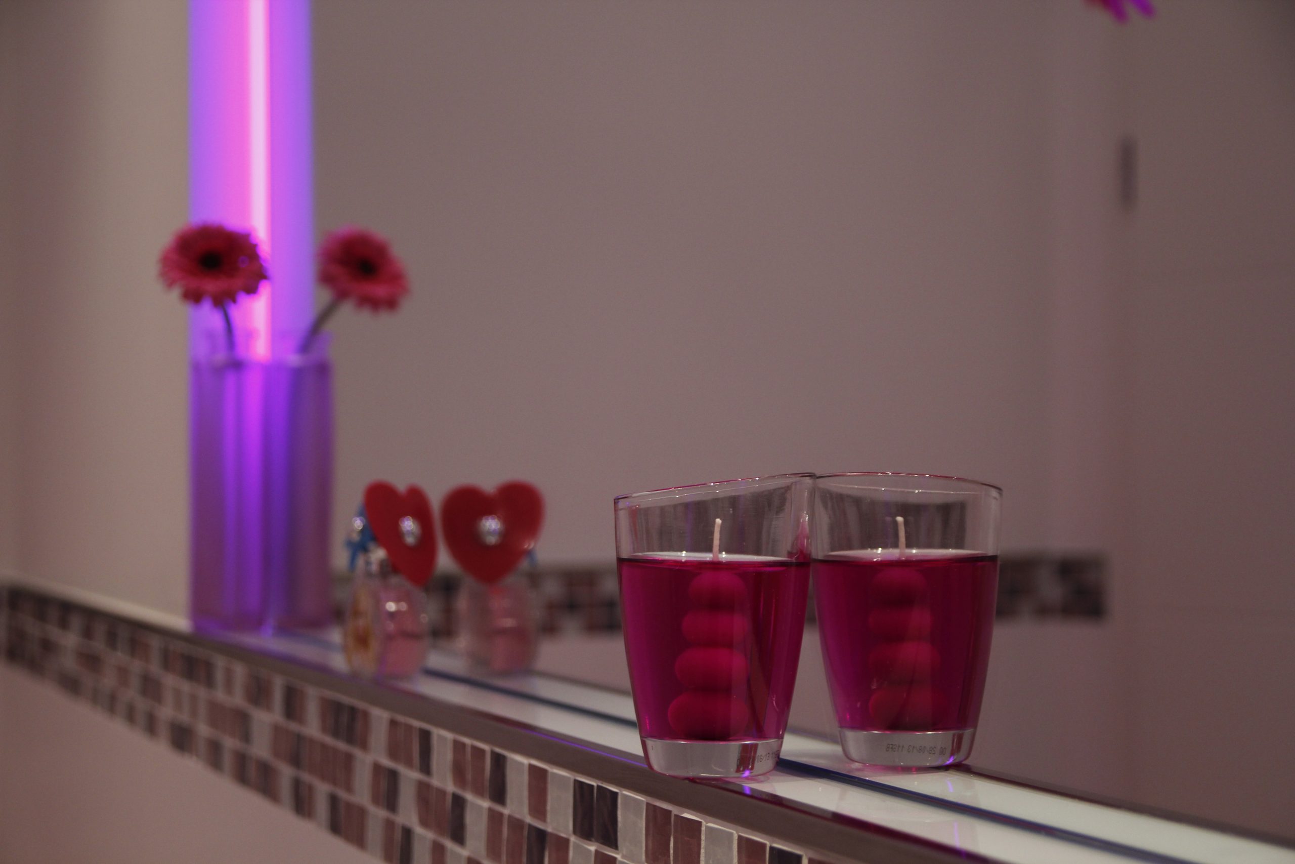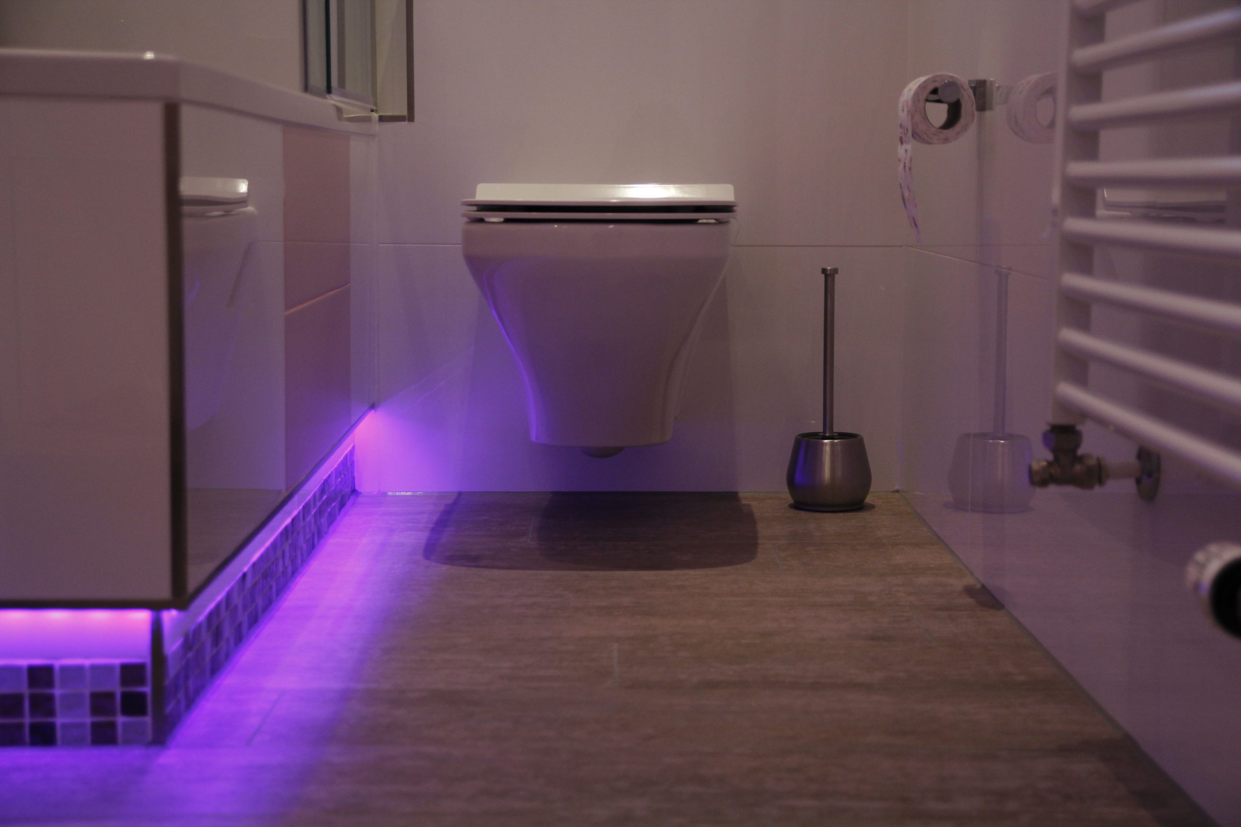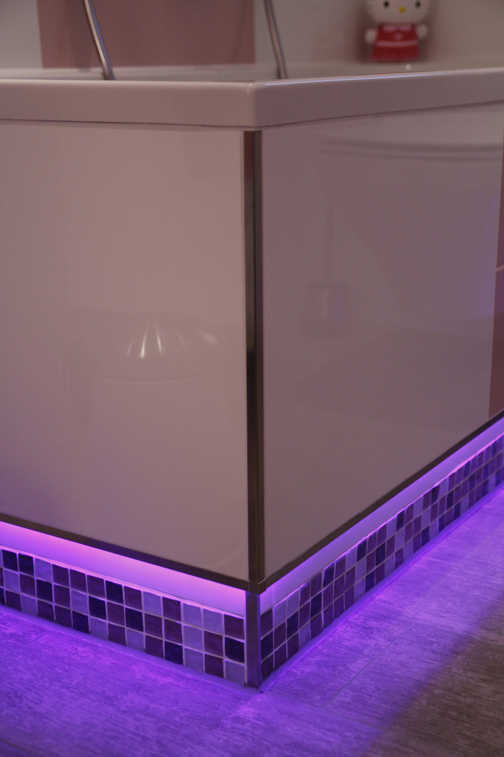 Modernes, kindgerechtes Badezimmer mit Badewanne und Duschzone in einem schmalen Raum. Helle Wandfliesen werden mit einer umlaufenden Mosaik-Bordüre und pinken Dekoelementen kombiniert. Highlight ist die indirekte LED-Beleuchtung im Sockelbereich von Wanne und Möbeln, die das Mosaik betont und dem Raum abends eine gemütliche, fast spielerische Atmosphäre verleiht.