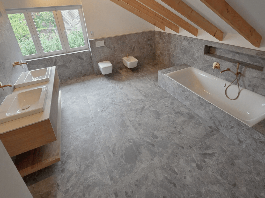 Großzügiges Dachgeschossbad mit durchgängig verlegten, grau marmorierten Großformatfliesen auf Boden und Wänden. Der freihängende Waschtisch mit Holzfront, goldenen Armaturen und die passenden Details an Wanne und Bidet sorgen für einen warmen, edlen Kontrast zur kühlen Steinoptik. Bodengleiche Dusche mit integrierten Wandnischen, viel Tageslicht und sichtbare Dachbalken machen dieses Familienbad zu einem modernen Wohlfühlraum.