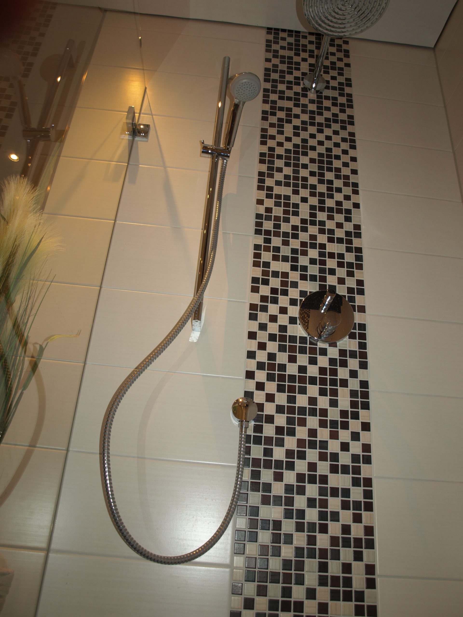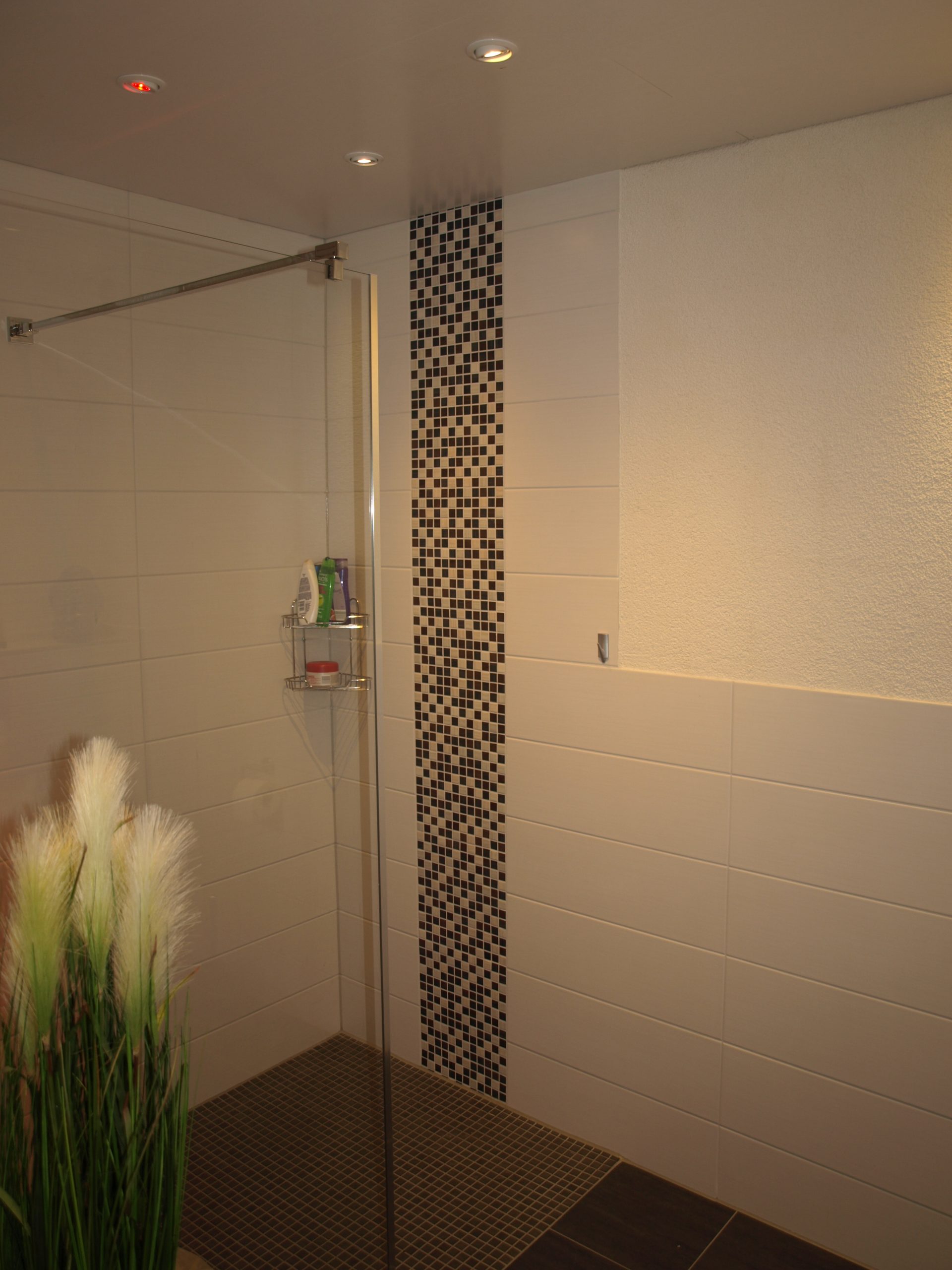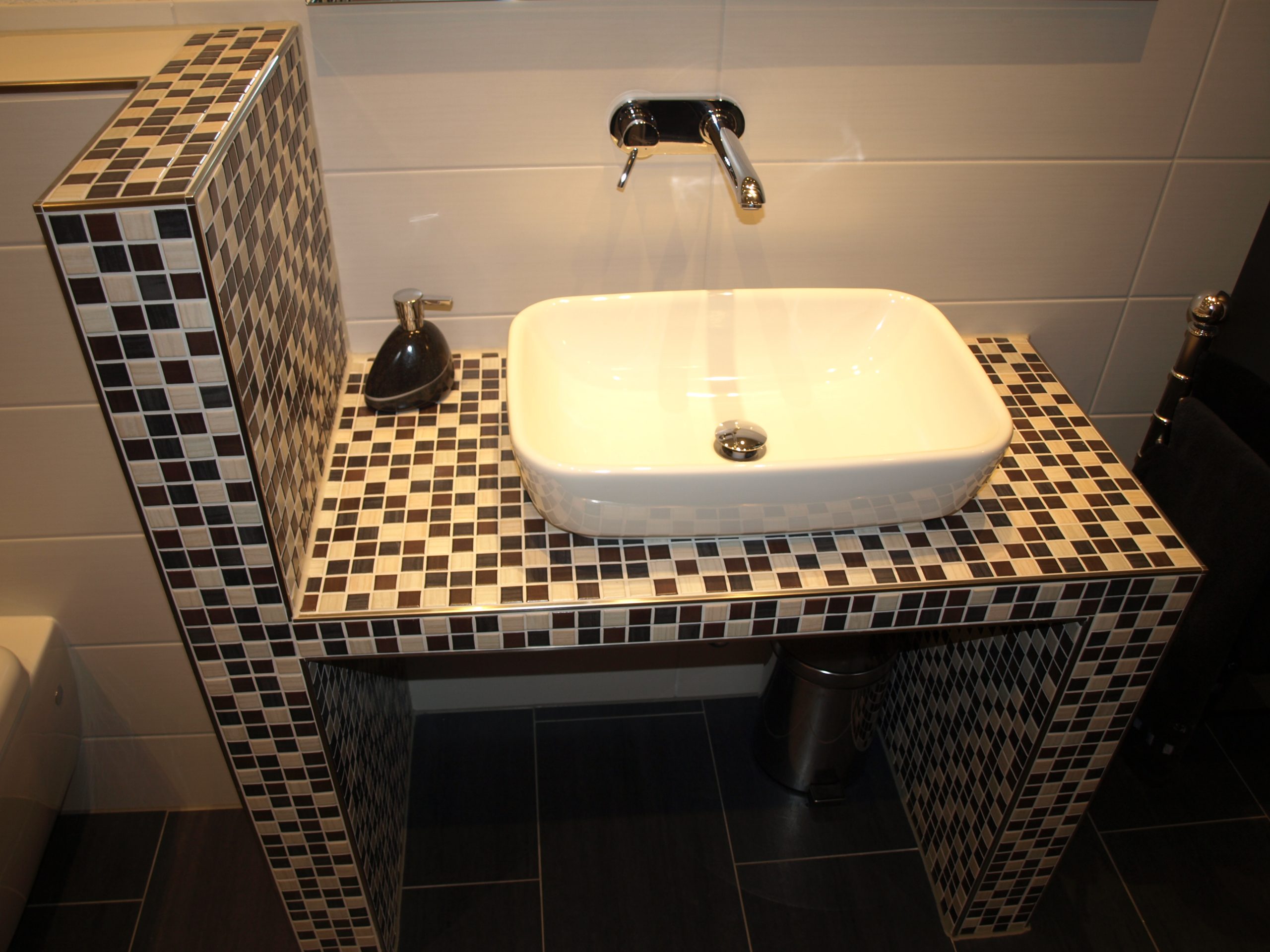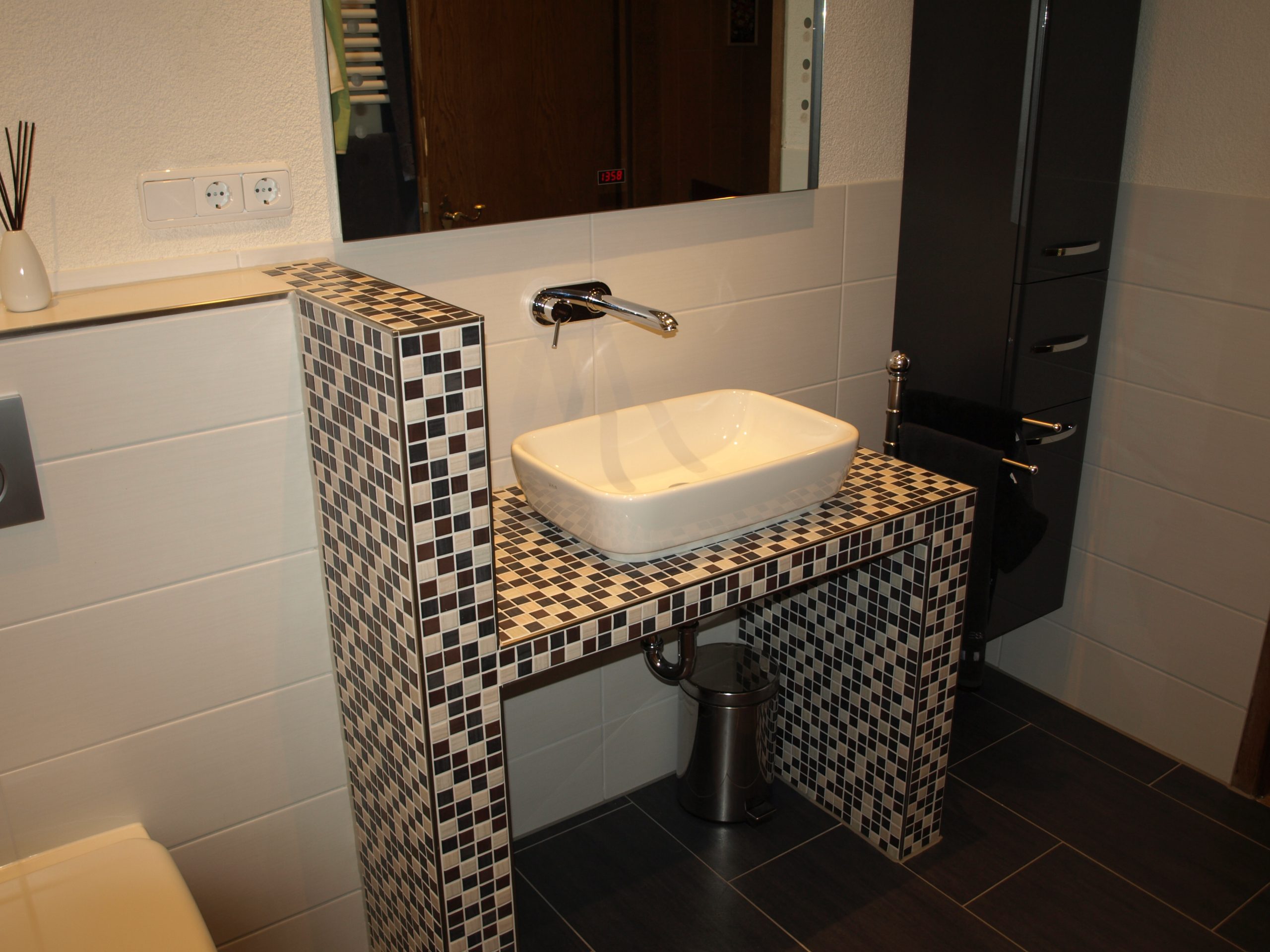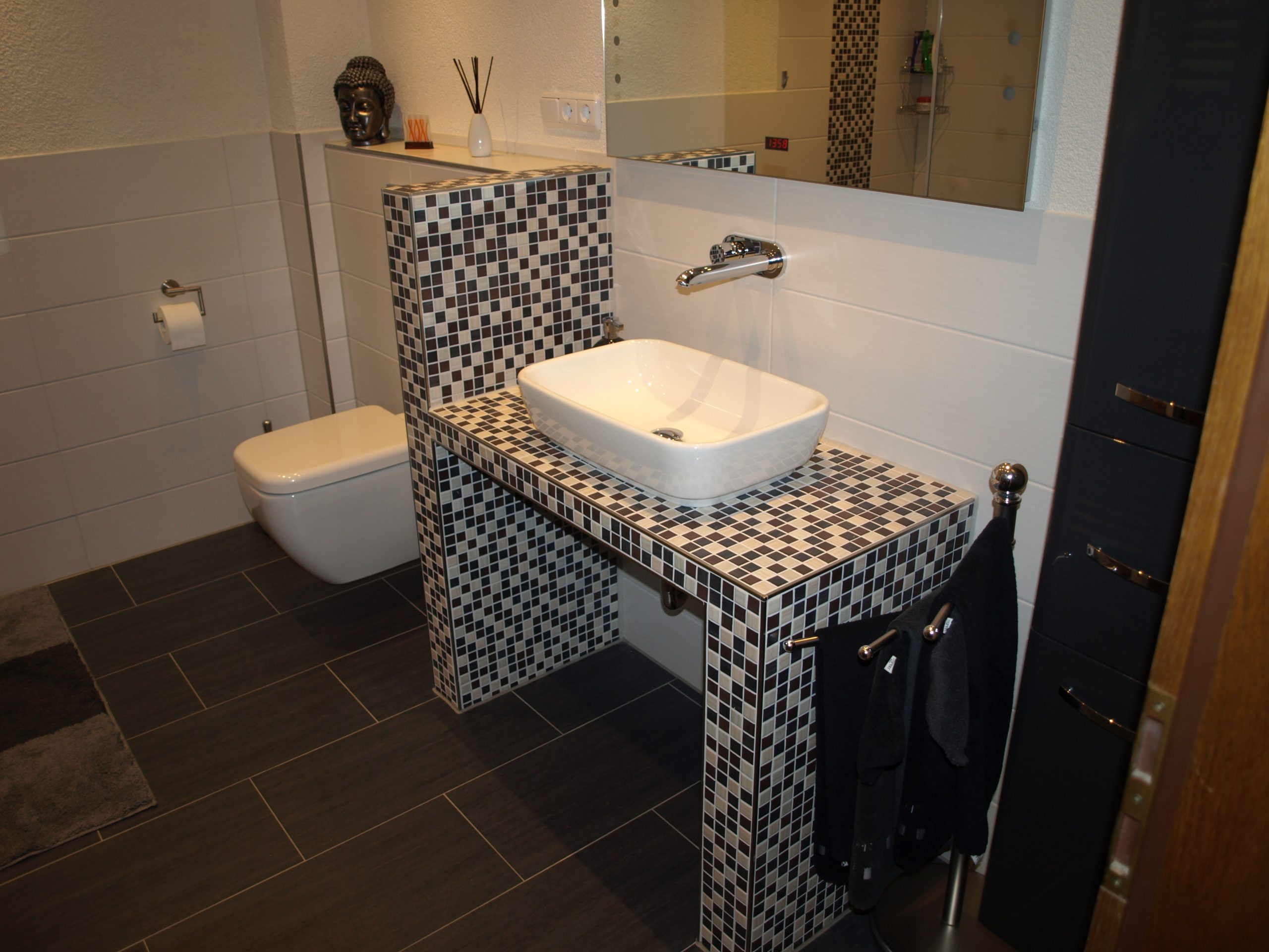 Kompaktes, modern gestaltetes Bad mit markantem Mosaik-Waschtisch und durchgängigem Farbkonzept in Schwarz, Weiß und Naturtönen. Der geflieste Waschtisch mit Aufsatzbecken greift das Mosaik der bodengleichen Dusche wieder auf, vertikale Mosaikstreifen setzen Akzente an der Duschwand. Großformatige, dunkle Bodenfliesen und helle Wandfliesen lassen den Raum ruhig und zugleich sehr hochwertig wirken.