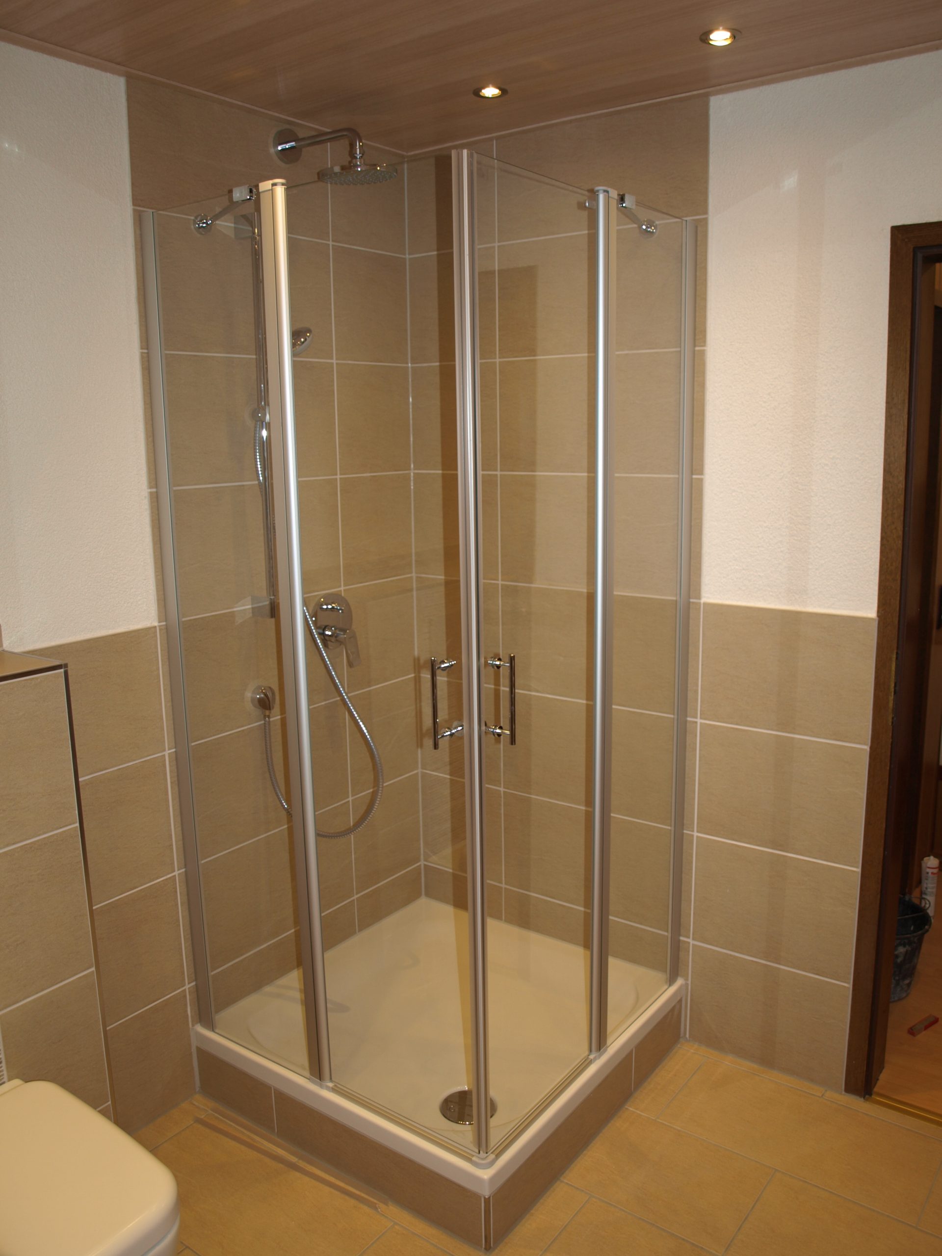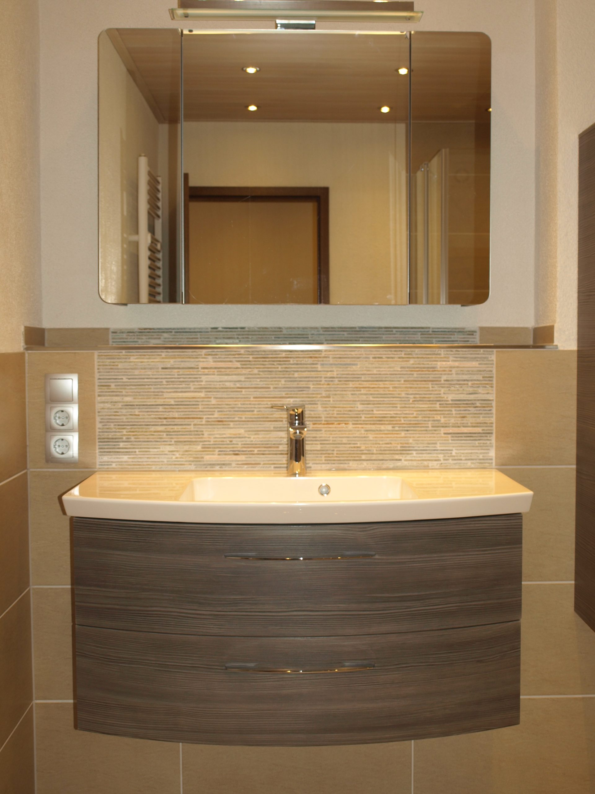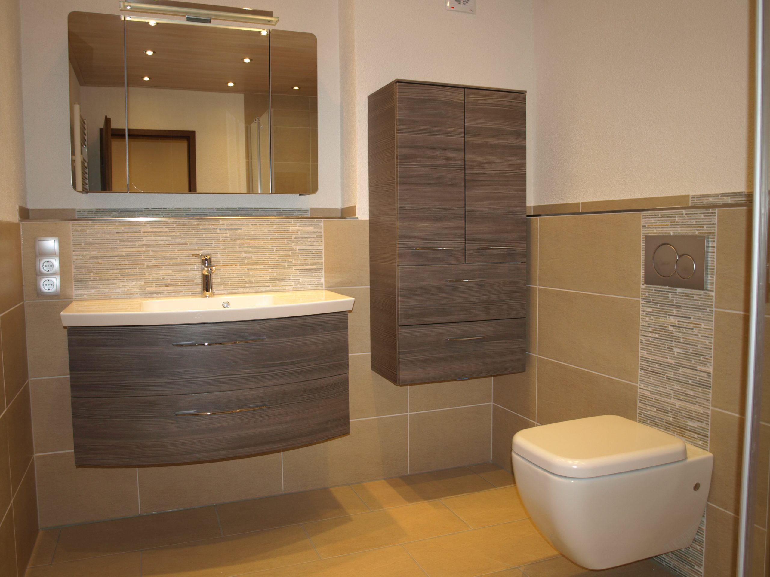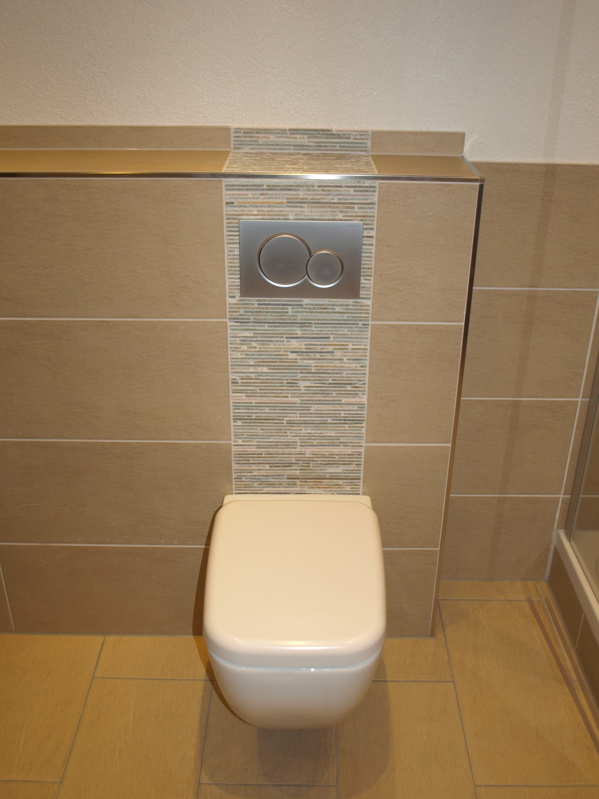 Helles, freundlich wirkendes Bad in warmen Sandtönen mit klarer Linienführung. Die Wände und der Boden sind in beigen Fliesen gehalten, dazu setzen schmale, horizontale Mosaikstreifen hinter WC und Waschtisch dezente Akzente. Ein moderner, schwebender Waschtisch in Holzoptik, eine Eckdusche mit Glasabtrennung und die abgehängte Decke mit Spots runden das ruhige, harmonische Gesamtbild ab.